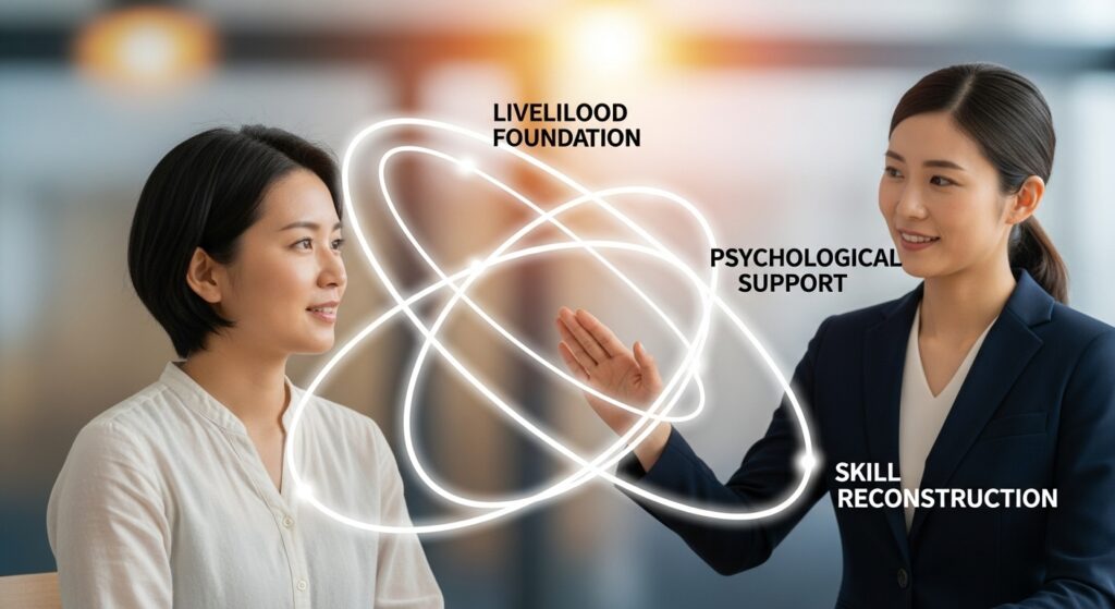 「求職者支援制度」による生活保障を受けながら、DX関連など市場価値の高い分野での学び直しを並行して提案します。同時に、クライアントの多様な経験を「ブリッジ人材」としての価値に言語化し、自己肯定感の回復を促します。